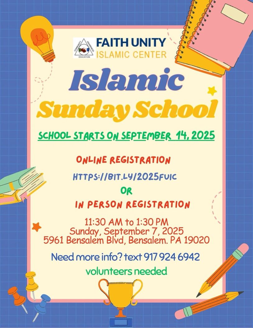 The Faith Unity Islamic School is aimed at providing basic Islamic education for children aged 5 and over. A typical day begins with a short discussion on a relevant subject with a take home message. Examples may include explanation of key Islamic concepts, lessons from history, or the life of the Prophet (pbuh) illustrating model conduct and etiquette. This is followed by two longer classes focused on Arabic reading and writing, salaat, learning surahs with meaning and context, Islamic principles, and the Seerah of the Prophet.